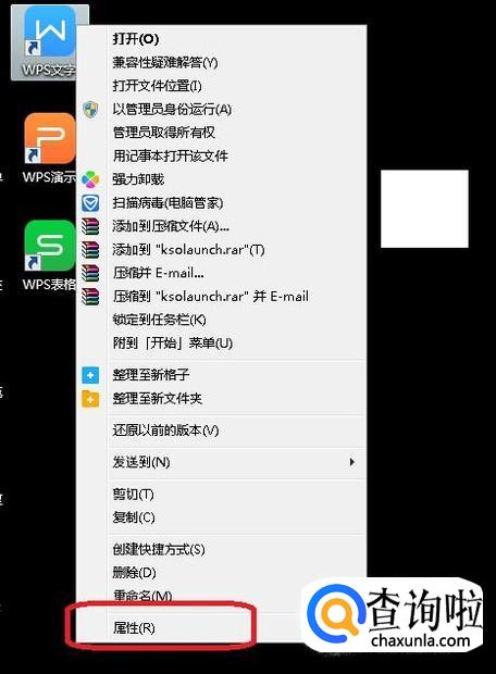 但要让软件默认以管理员身份运行, 还需要设置一下。我们任选一个软件来演示,如图所示,我们右键点击WPS软件快捷方式,选择“属性”。