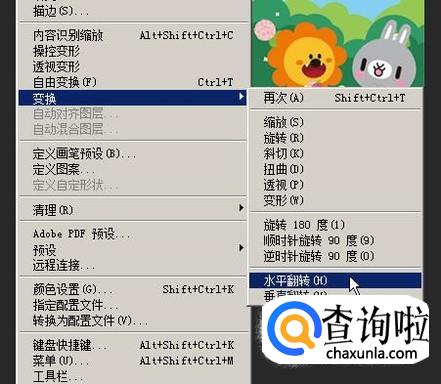点“变换”后,右侧即弹出一列子菜单,再从中点击:水平翻转