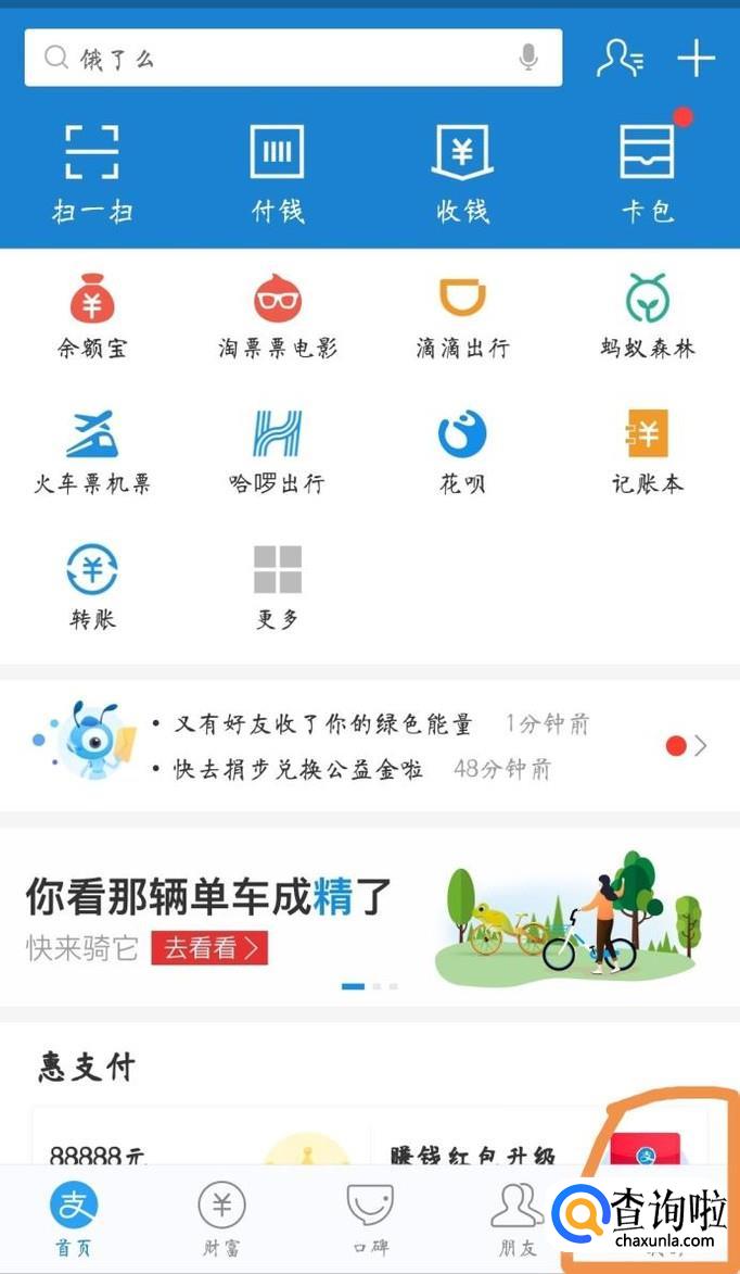 首先点击支付宝首页的右下角“我的”功能。