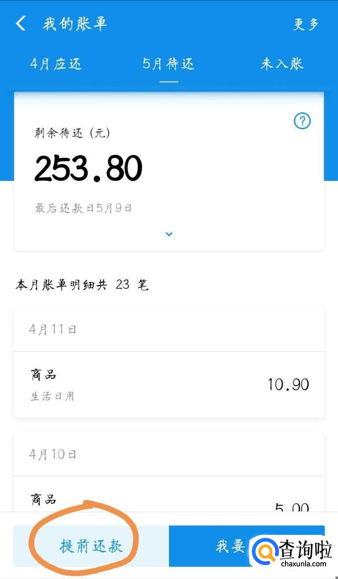 在账单页面的下方可以看到有个“提前还款”的功能,点击进入。