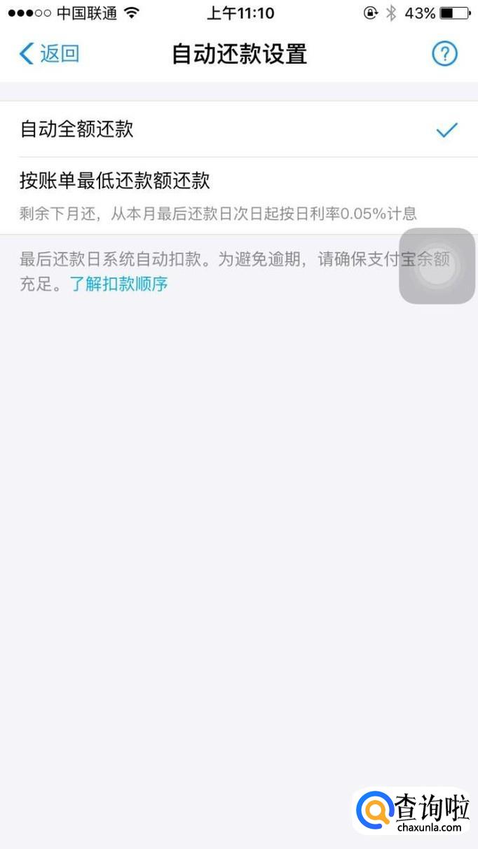 然后点击“自动还款设置”在这一设置中有自动全额还款和按账单最低还款额还款,最好选择全额还款,因为免利息
