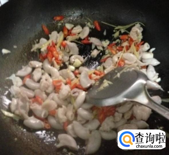 葱姜蒜爆香后,加入腌制好的生肠翻炒,为了增加颜色和口感我们可以加入一些辣椒翻炒,最后加入半碗水闷一下就可以出锅了。