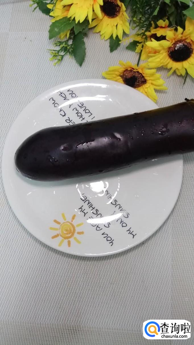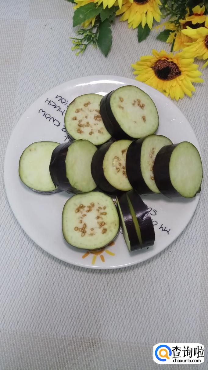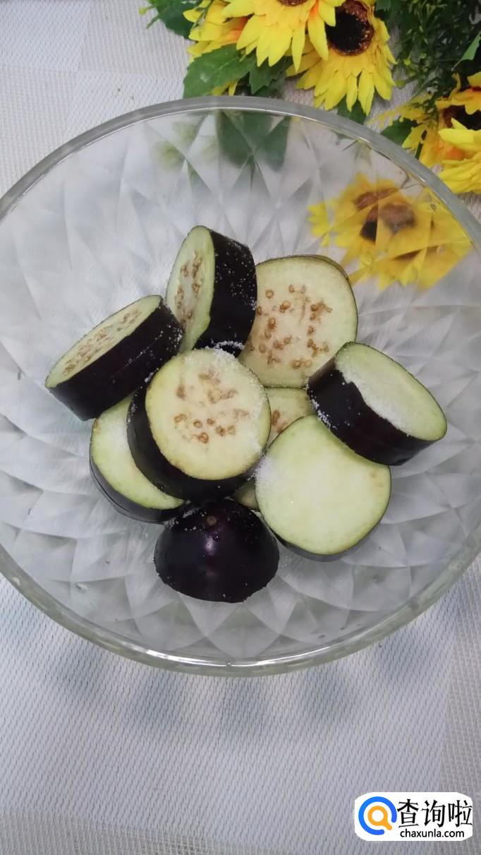 准备一根茄子,洗净后切成1.5厘米宽的厚片,然后再从中间切开,不要切断,洒上适量盐,腌制20分钟左右,腌出水分,然后用清水洗一下。