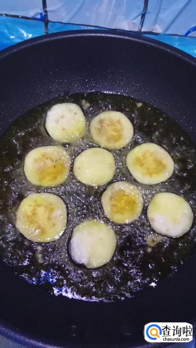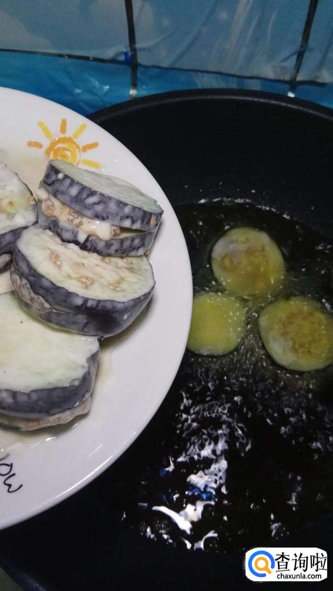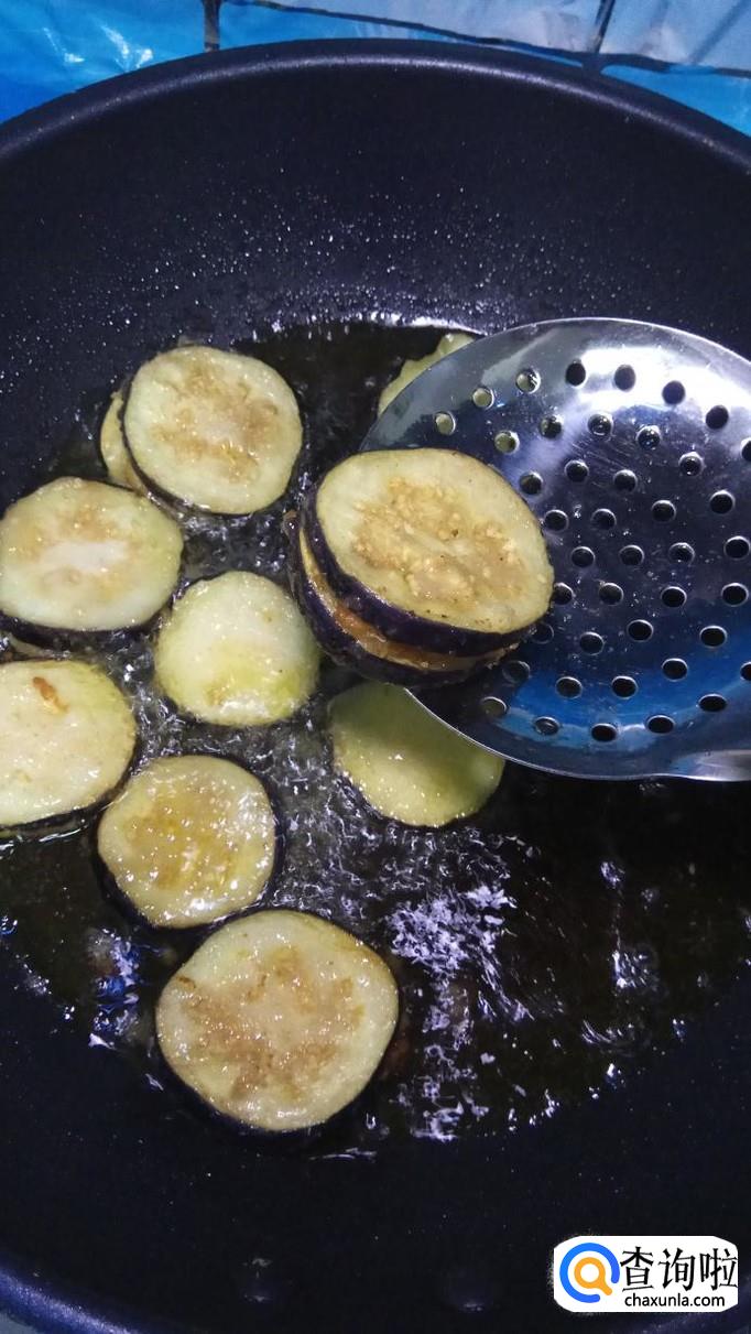 锅中放入适量油,油温五成热,将茄盒放入锅中小火慢炸,炸至金黄。因为裹上了面糊,茄盒里面的五花肉不容易掉出来。