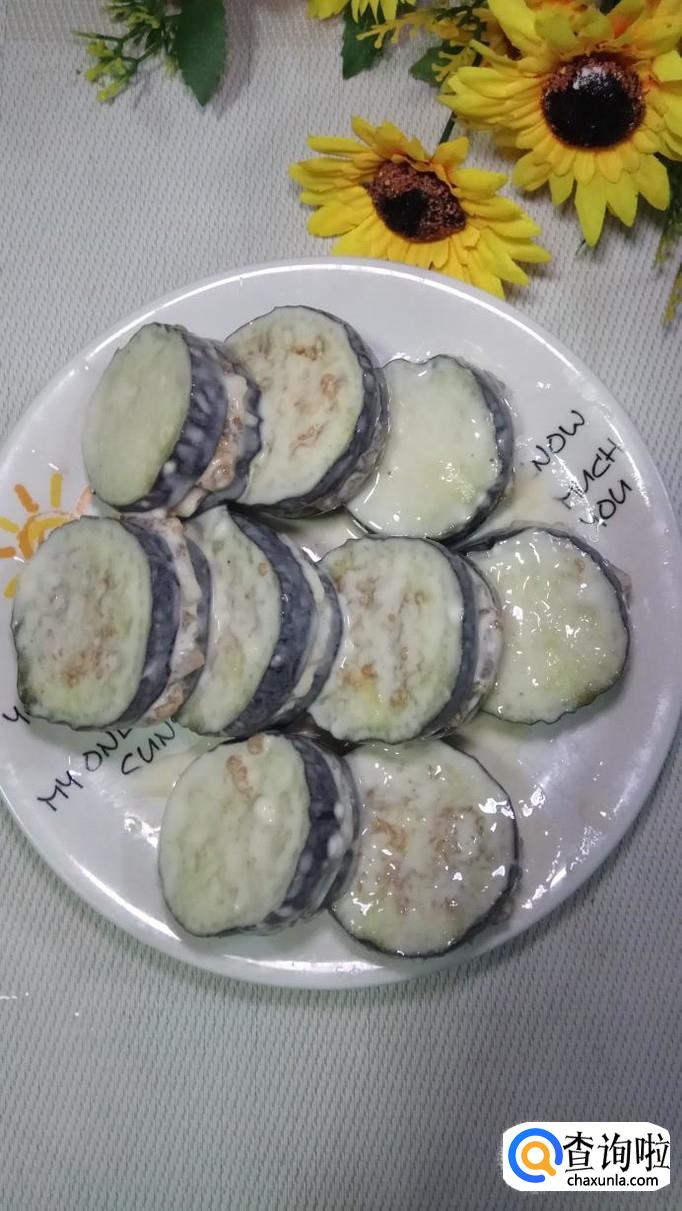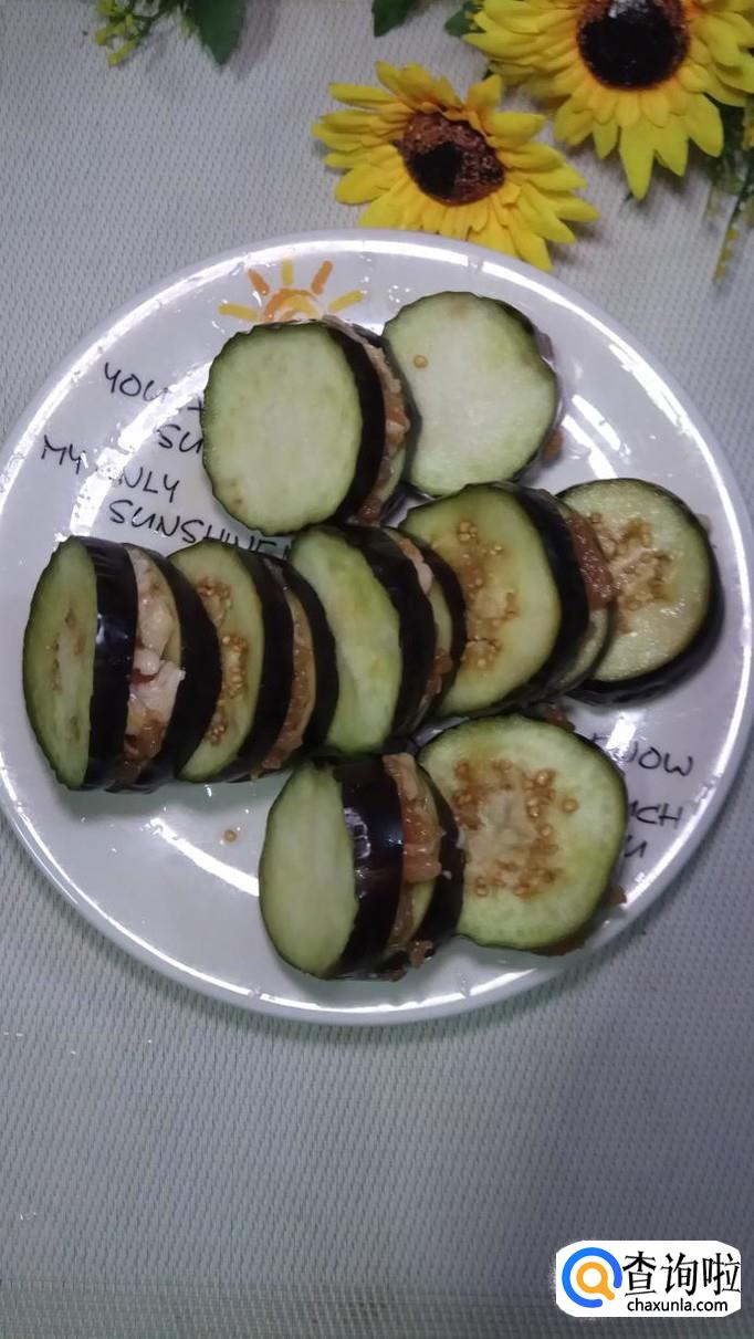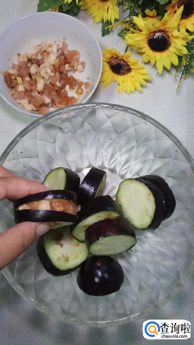 将腌制好的五花肉夹在茄子中间,做成茄盒,摆入盘中备用。