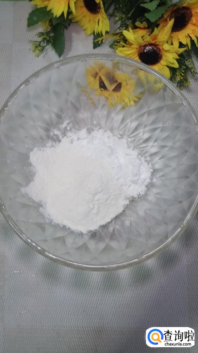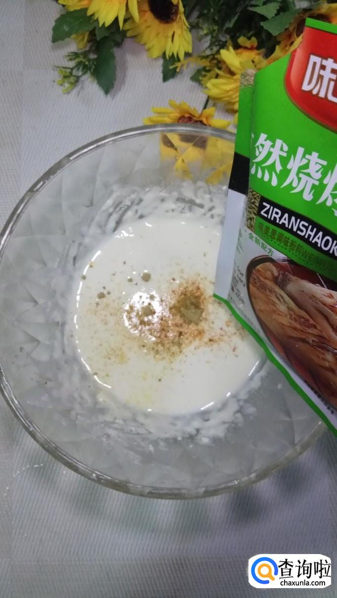 碗中放入适量淀粉,再放入适量面粉,搅拌成稀糊状,再放入适量盐,孜然烧烤料,搅拌均匀。