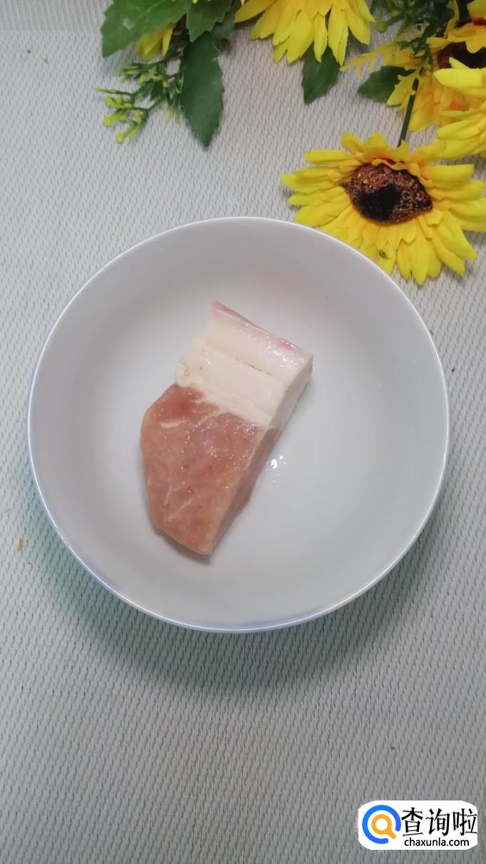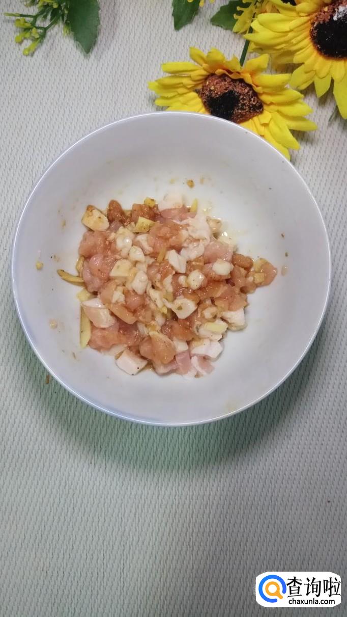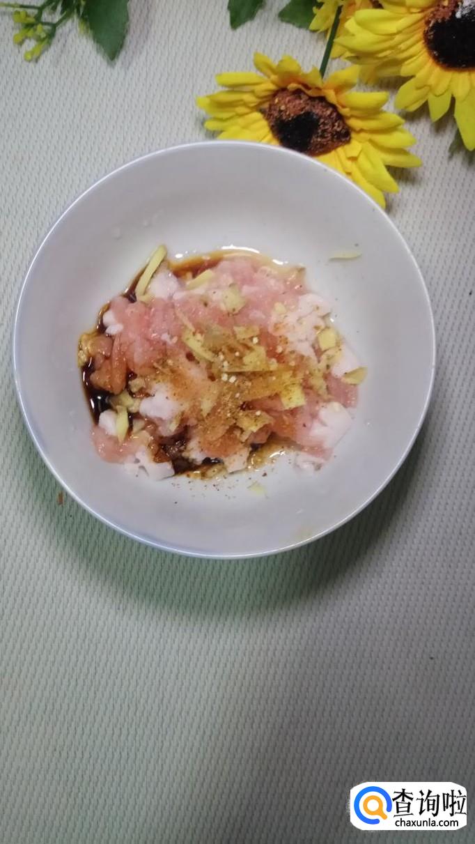 准备适量五花肉,切成末,放入适量盐,鸡精,五香粉,生抽,料酒,姜末,腌制15分钟。