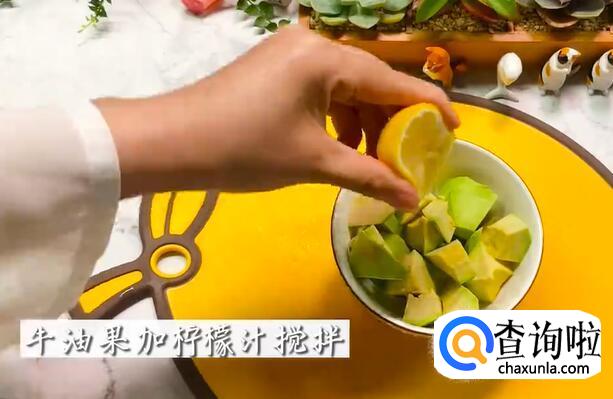 牛油果中加入柠檬汁,搅拌。