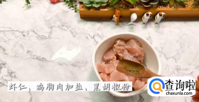 虾仁、鸡胸肉加盐、黑胡椒粉,加入橄榄油搅拌均匀,腌制10分钟。