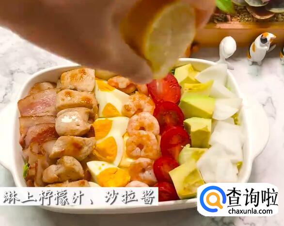 牛油果、圣女果、鸡蛋、柠檬、鸡胸肉、虾仁、黑胡椒粉、橄榄油、洋葱、培根、芝士、苦菊