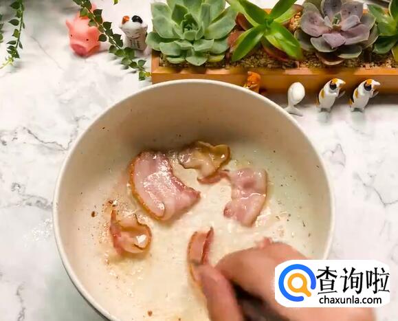锅中放油,依次煎熟虾仁、鸡胸肉、培根。