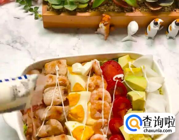 把准备好的食材依次铺上去,然后均匀的挤上柠檬汁和沙拉酱即可。