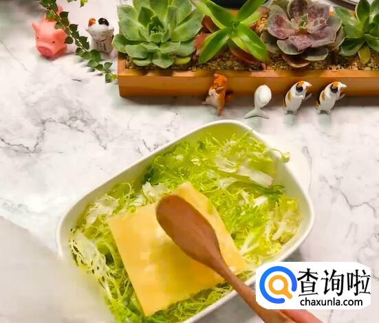 碗底铺上苦菊,再放上两片芝士。