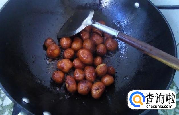 炒制小土豆表面呈微焦色后,放入一碗水,然后分别倒入生抽、老抽(量大一点)、少许盐、糖、姜片一起炖制。