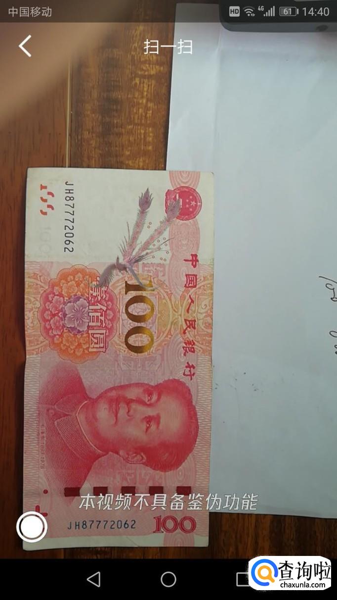点击“+”后,进入“扫一扫”界面,如图扫描一张新版100元人民币,即出现了凤凰。