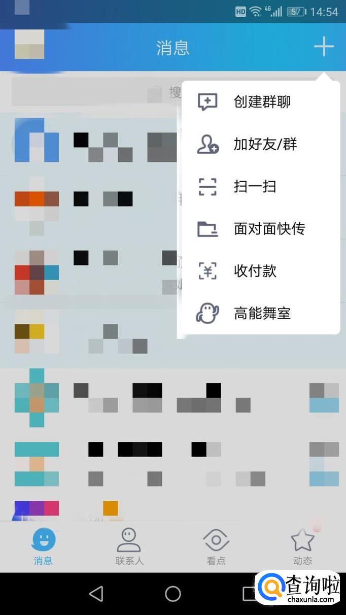 首先,打开新版的手机QQ,打开手机QQ后,可以看到右上角有个“+”,点击“+”进入。