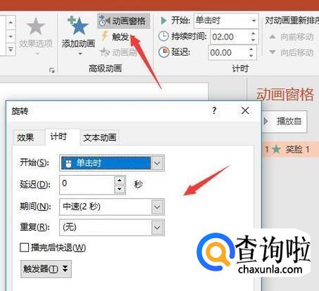 设置图片播放的时间需要在动画窗格中的旋转窗口设置,点击动画窗格,然后将计时选择进来,然后再点击进行设置即可。