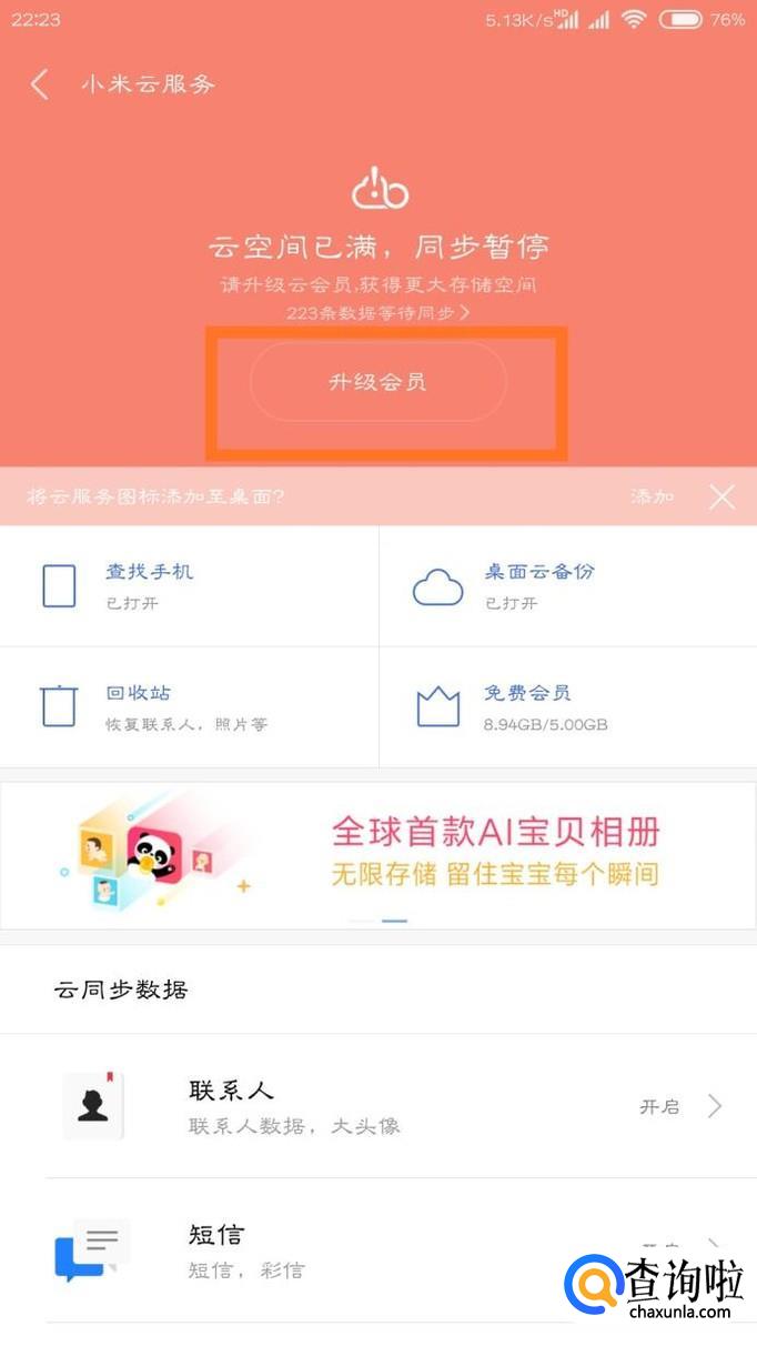 首先打开小米云服务,看到“云空间已满”下面有一个“升级会员”,点击即可进入会员购买页面,这是增加空间最快最方便的方法。