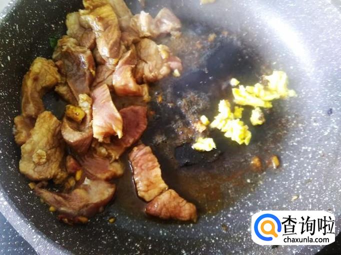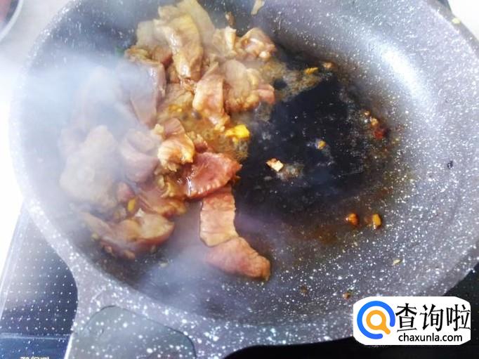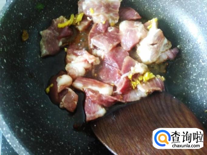 翻炒到肉片变颜色就铲到锅边,再下适量的油到锅空格,然后下姜蓉进去爆出香味。