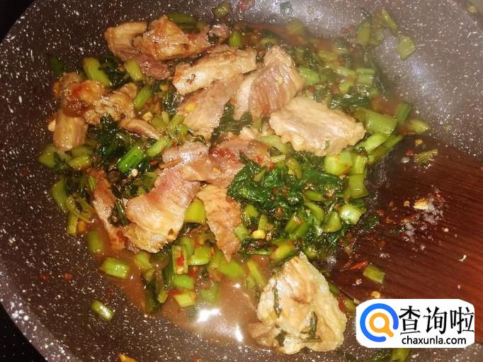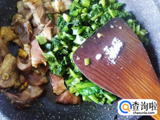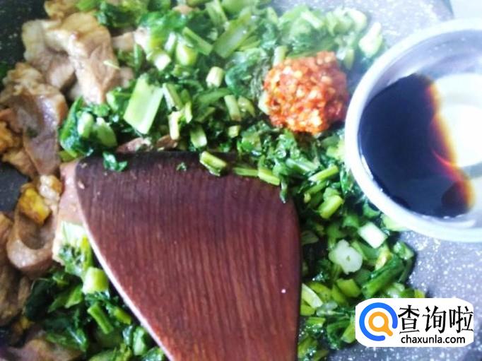 把腊菜下到锅空格,加适量的盐、小半勺生抽、1小勺辣椒酱。