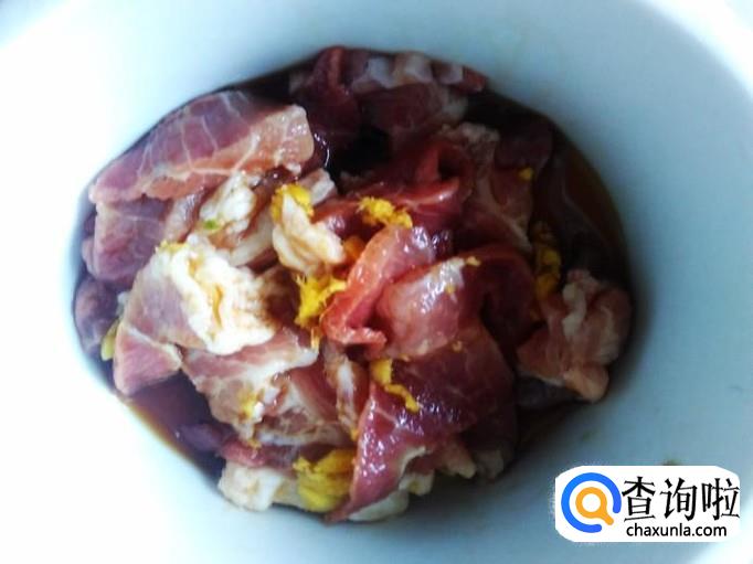 猪肉切成肉片,加适量的盐、姜蓉、生抽、料酒腌制几分钟。