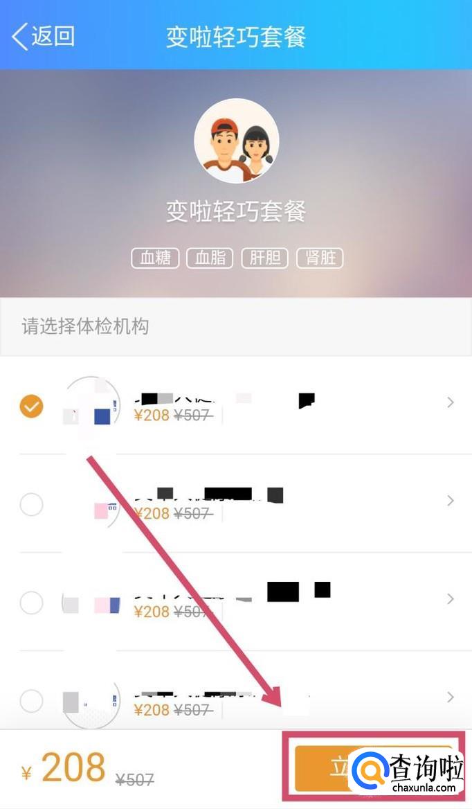 这里我随意打开了一个套餐,选择相应的机构,点击页面右下角的“立即预约”,如图所示。