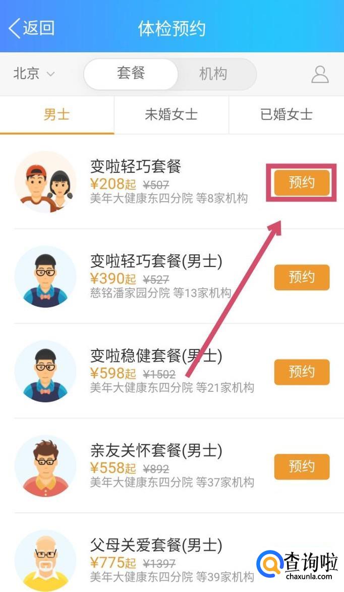 进入到“体检预约”中,选择你的身份、地区等信息进行筛选,然后找到你希望预约的体检,点击进入。
