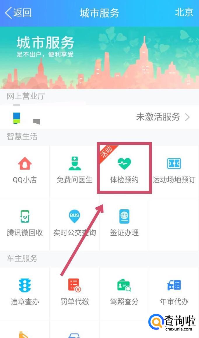 进入到“城市服务”界面,然后在“智慧生活”一栏下找到“体检预约”,点击进入。