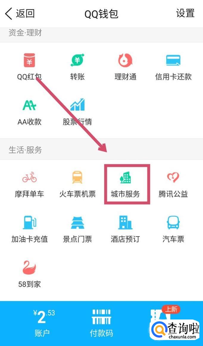 进入到QQ钱包界面,往下拉,在“生活服务”一栏下找到“城市服务”,点击进入。