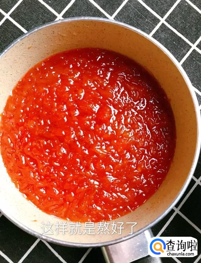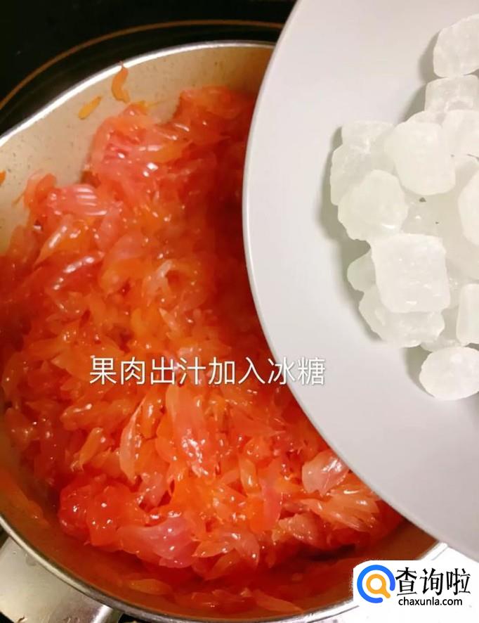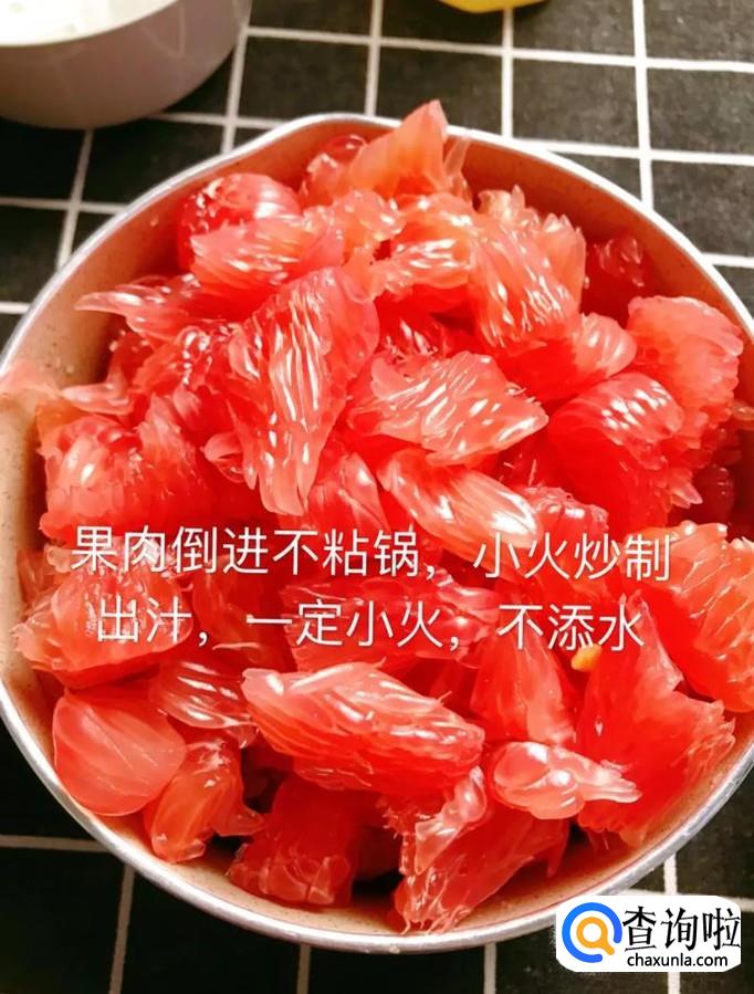 然后把柚子肉倒进不粘锅,小火炒至出汁,如图所示。小贴士:这个过程一定要开小火而且不能加水。