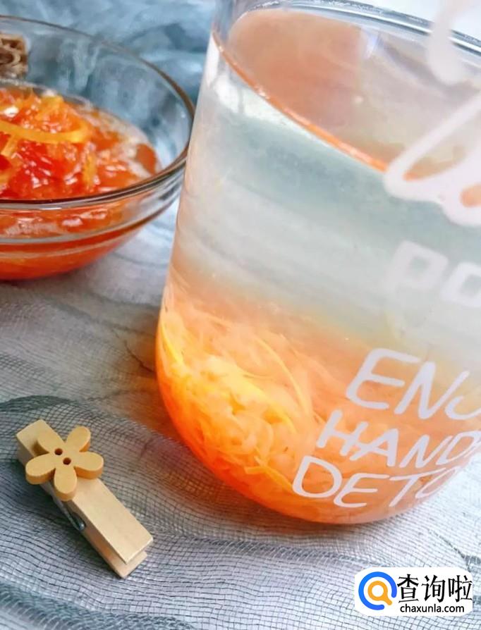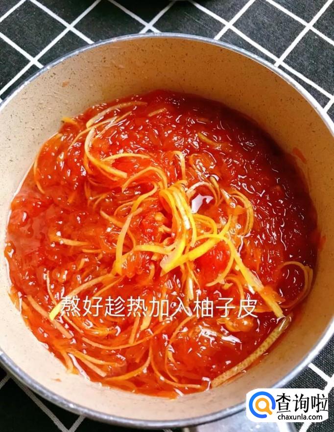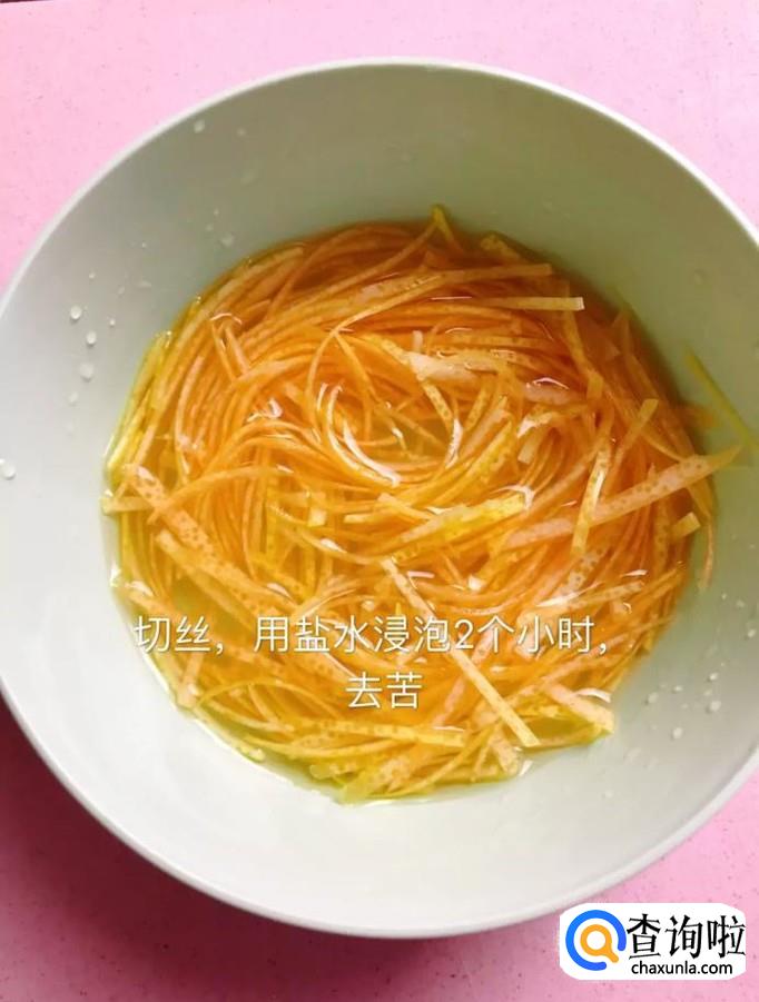 接着将柚子皮擦成丝,用盐水浸泡两个小时,如图所示。小贴士:这样做能够有效的去除柚子皮中的苦味。