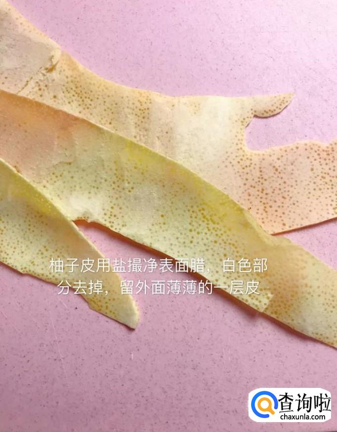 然后用盐将柚子皮的表面中的蜡清洗干净,之后将柚子皮白色部分去除,如图所示,