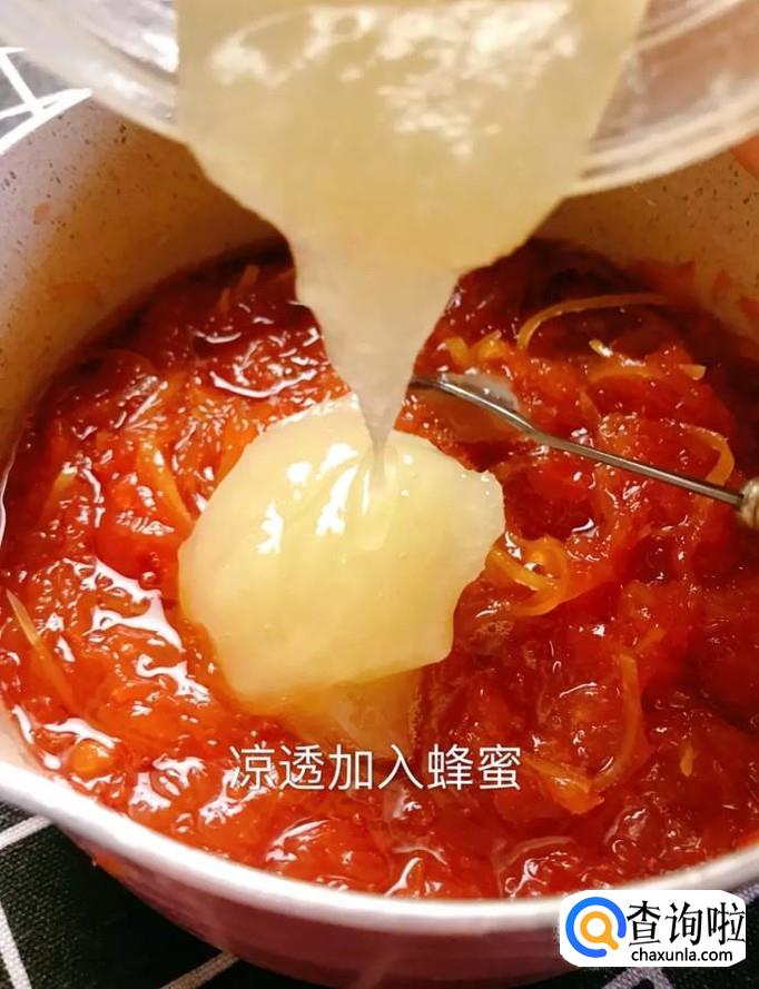 然后等到柚子完全放凉,加入蜂蜜搅拌均匀,如图所示。