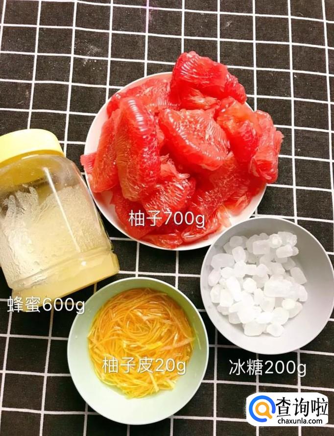 首先准备好所有要用到的食材,如下图所示。小贴士:柚子700克,蜂蜜600克,柚子皮20克,冰糖两百克。