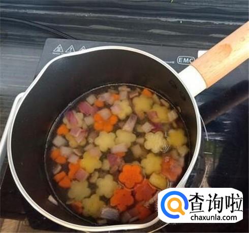 热锅下油,放入土豆、红萝卜、火腿,翻炒均匀,然后加入适量的清水。