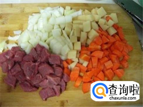 把土豆、红萝卜、火腿,都清洗干净,然后切丁。