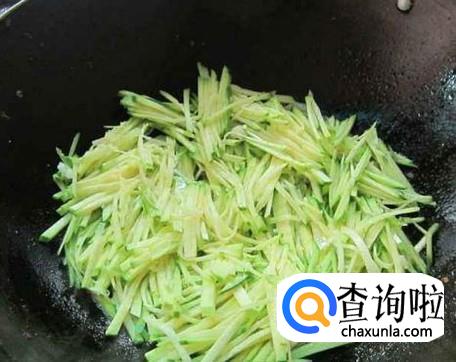 将南瓜丝倒入锅中,用铲子翻炒均匀,使每一根南瓜丝上都粘上油。