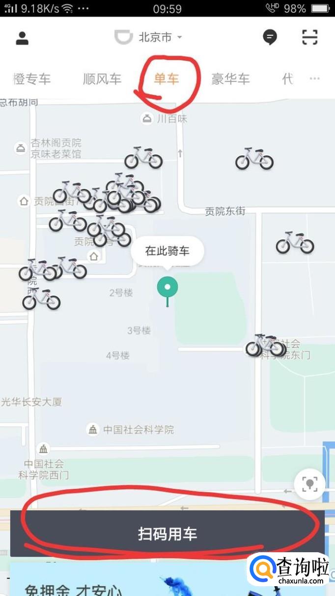 点击最上面的“单车”,之后点击“扫码骑车”。