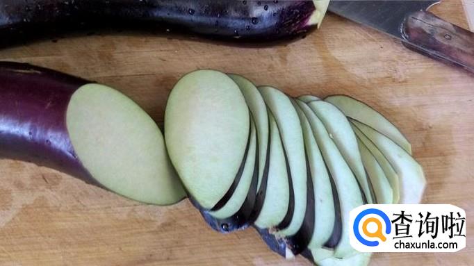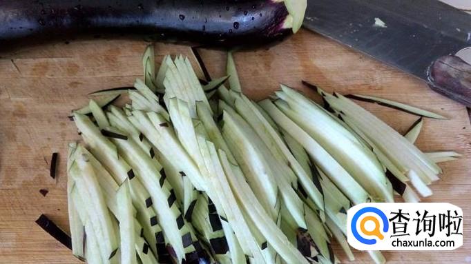 准备切茄子丝,先用刀去掉把,再斜着切茄子片,切完片后再切丝,依此顺序把两个茄子都切好备用。