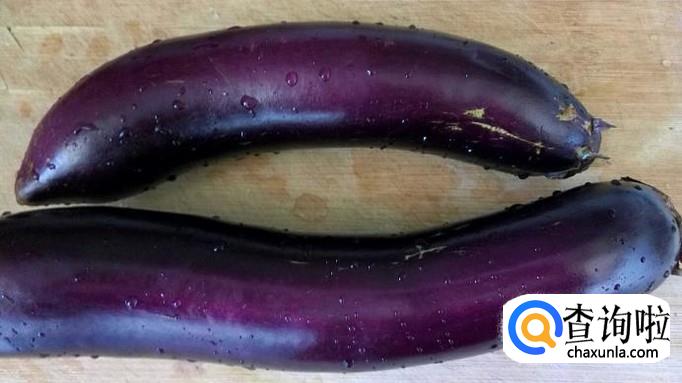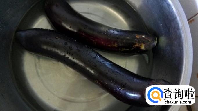 新鲜的茄子两个,放入洗菜盆,开水龙头把茄子冲洗干净,放在切菜板待用。