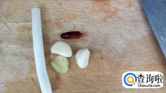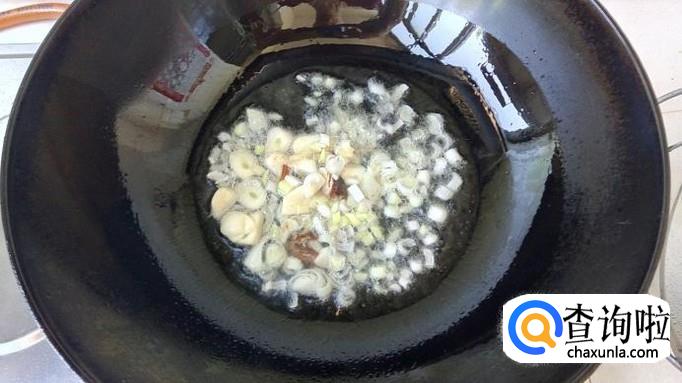 开火,把炒锅放好,热锅凉油,把准备好的葱、姜、蒜、辣椒放进油锅爆香。(能吃辣的可以多放些辣椒,家里有不能吃辣的,我就放了一点有的微辣。)