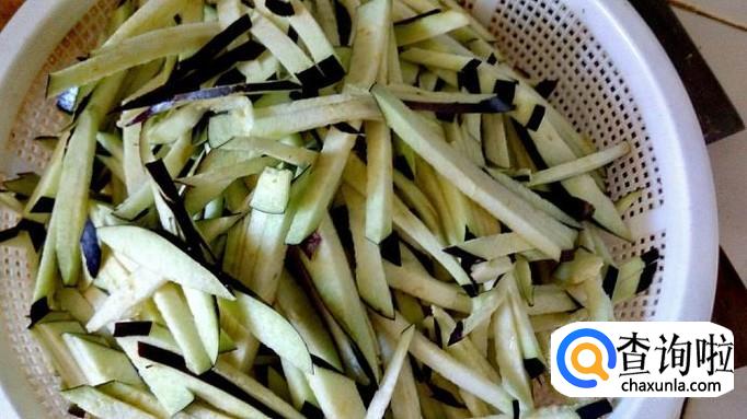 爆香锅后,把切好的茄子丝到处油锅。要想炒的茄子丝不发黑,切好的茄子丝,放入菜筐中,用清水冲洗一遍。