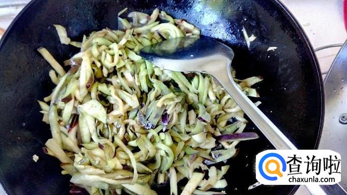 把冲洗过的茄子丝倒入油锅后,快速翻炒均匀,等茄子丝断生后进入下一步。
