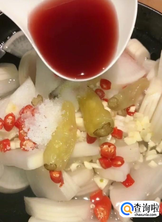 然后再放入适量的白醋,盐,白糖,红酒放入密封罐腌制一个晚上