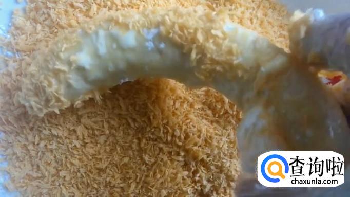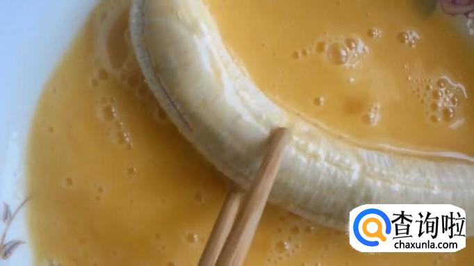 将去皮的香蕉放入蛋液碗中,是香蕉表面沾匀鸡蛋液。