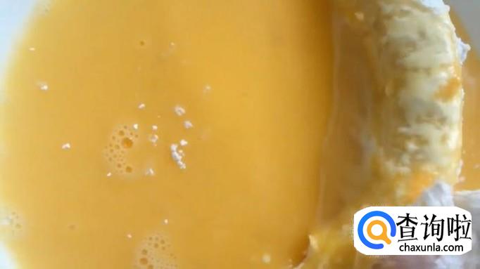 将裹好淀粉的香蕉再次放入鸡蛋液中,使香蕉表面再次沾上蛋液。
