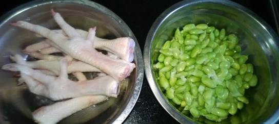 1、食材准备:鸡爪几个,洗净,每个鸡爪切成两段;毛豆米一碗,洗净沥干水;配料:生姜切丝,小米辣切碎,蒜粒拍扁,八角一个,花椒一小把。