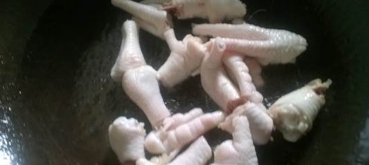 4、倒入没过鸡爪的热水或者高汤(量多),大火煮开,中小火焖煮20分钟,看到汤汁明显变少,加少许盐调味。