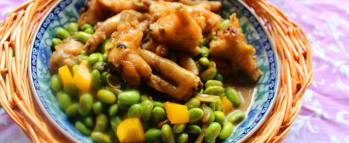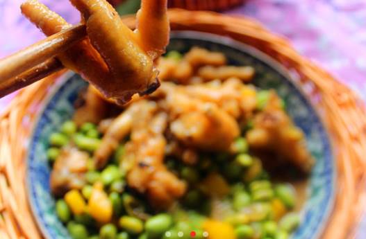 例如“鸡爪烧毛豆米”。做法:先焯水,将鸡爪放入冷水中,加入花椒、生姜丝、料酒,大火煮开,中小火再煮5分钟,捞起,洗干净沥干水。热锅热油将鸡爪放进去翻炒,然后放入:生抽、老抽、五香粉、糖、醋、盐、小米辣、八角、姜片、蒜,快速翻炒均匀,炒出香味。大火煮开,中小火焖煮20分钟,加少许盐调味。最后再将毛豆米放入继续焖煮,直到毛豆米软嫩即可。