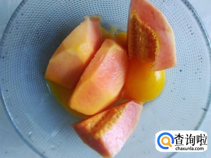 木瓜去皮去籽,然后把一小半木瓜切成几块放到到蛋黄里。